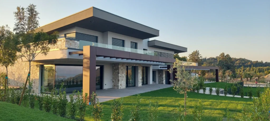 Il progetto si inserisce in un contesto paesaggistico unico, nella zona collinare di Costermano con vista diretta sul lago. Le esigenze architettoniche e abitative ruotavano attorno a un concetto chiave: valorizzare la vista, senza sacrificare performance e sicurezza. Per questo, sono stati utilizzati infissi Schüco AWS 75 per le finestre e scorrevoli ASE 80 HI per le ampie aperture, entrambi con triplo vetro antieffrazione, in grado di garantire prestazioni elevate in termini di isolamento termico, sicurezza e luminosità. I punti angolari dell’edificio sono stati trattati con giunzioni vetro-vetro, evitando i montanti in alluminio e ottenendo così una continuità visiva totale sul paesaggio. A completamento dell’involucro vetrato, sono stati progettati e installati frangisole ad angolo, realizzati in tinta con i serramenti, che si integrano perfettamente nella facciata, offrendo protezione solare e coerenza estetica. Il risultato è un insieme architettonico essenziale, silenzioso e raffinato, dove la luce e il paesaggio diventano parte integrante dello spazio abitato.